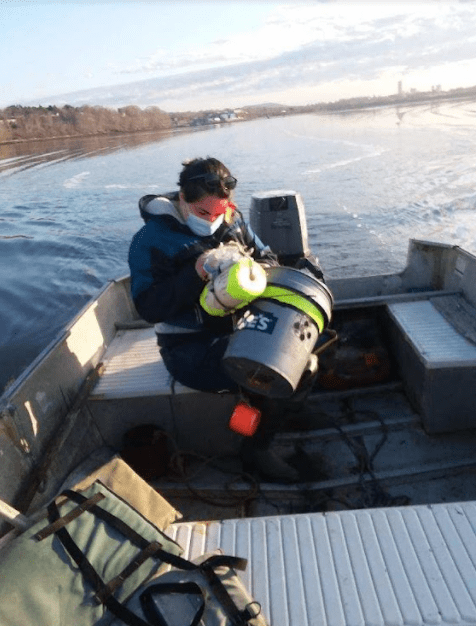 The drifters are equipped with GPS and released into the river. Tracking their movement provides a picture of tidal circulation patterns. An Acoustic Doppler Current Profiler (ADCP) was also used to measure how fast the current moves across a water column. With the data gathered by the drifter buckets and ADCP, Gabby and UMaine professor Lauren Ross created models of the Georges River estuary.